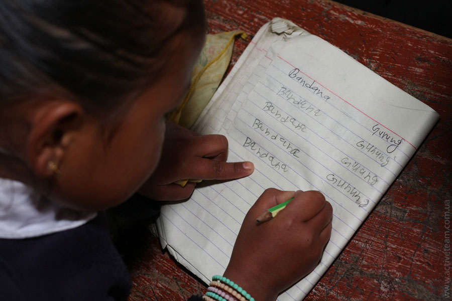 учитель старательно выводит на доске буквы родного языка непали. Сделав